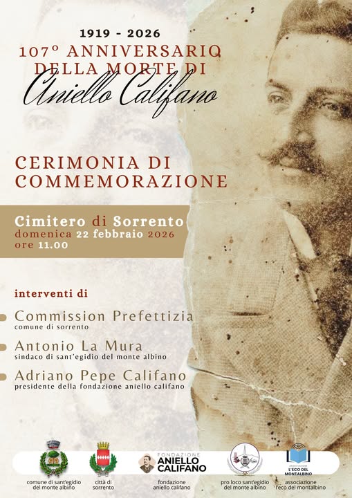 Il grande Califano verrà ricordato in una cerimonia pubblica che si terrà il 22 febbraio 2026 alle ore 11:00, al Cimitero di Sorrento, dove riposano le sue spoglie mortali, alla presenza del Sindaco di Sant’Egidio del Monte Albino Antonio La Mura, di un rappresentante della Commissione prefettizia che amministra attualmente il Comune di Sorrento, della famiglia Pepe – Califano e delle realtà associative impegnate nella valorizzazione della sua straordinaria figura.